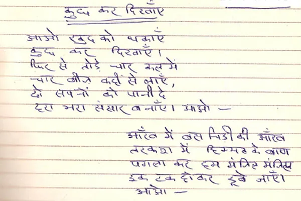 Aao khud ko thakayen Kuchh kar dikhayen Phir se toden chaar kalmein Chaar beej kahin se layen Do sapnon ko paani de Hara bhara sansaar banayen Aao khud ko thakayen Kuchh kar dikhayen